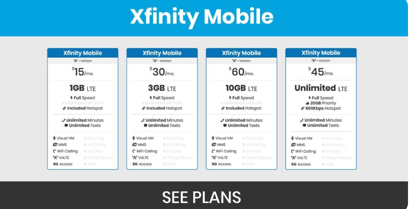 Answer: The biggest catch is that you must have Xfinity residential internet. You cannot get this mobile plan without it. Also, if you ever cancel your home internet, your mobile bill will jump up by about $25 per line. So, only switch if you are happy with their home internet service.